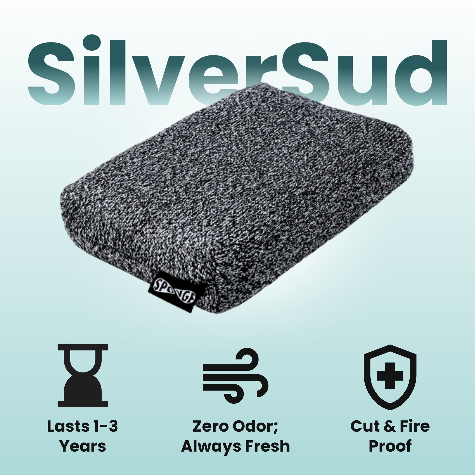 Regular sponges are made of porous foam that traps bacteria, breaks down fast, and smells awful. The SilverSud™ Sponge is woven with real silver fibers that fight bacteria, reinforced with protective layers for strength, and built to last years — not weeks.