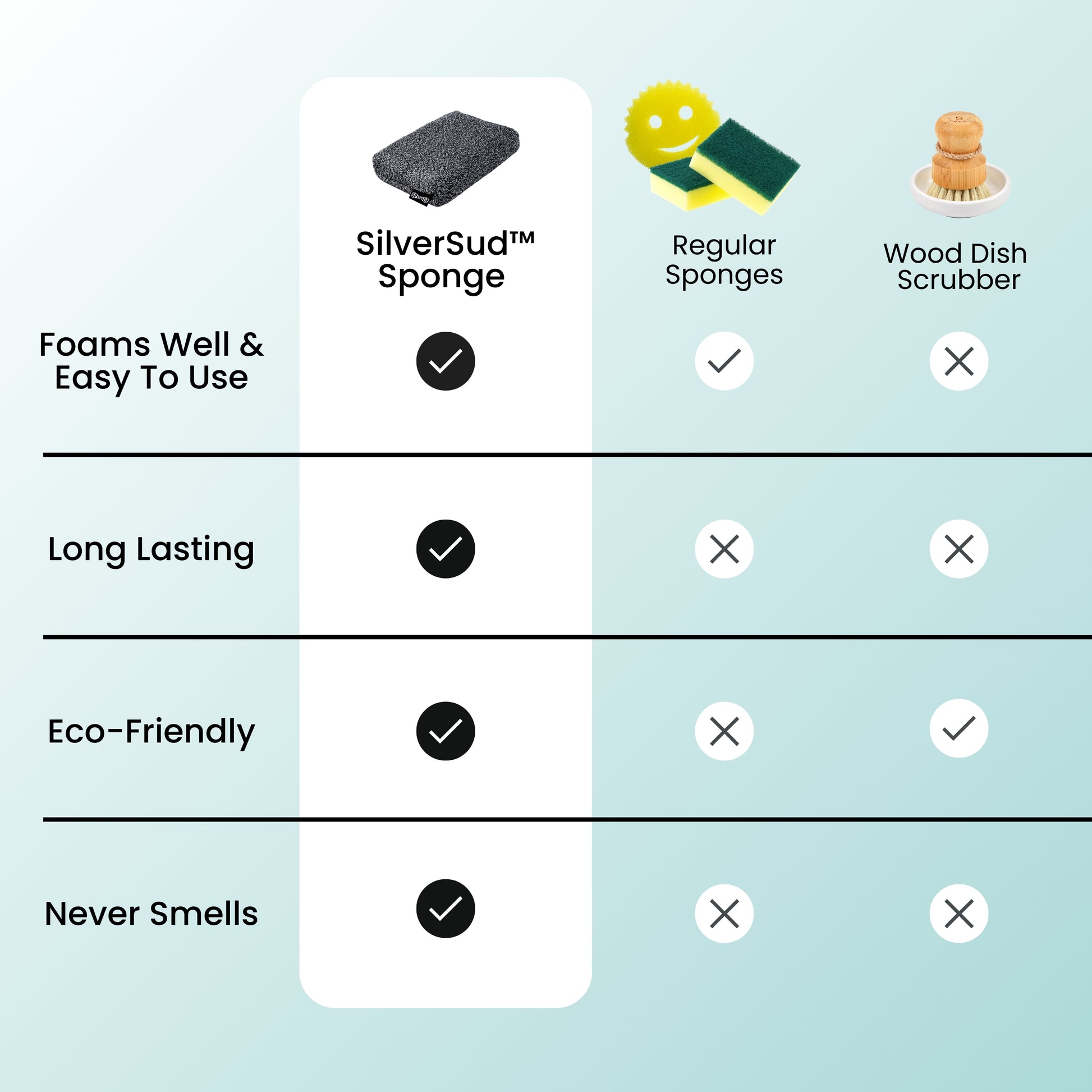 With normal use and proper care, each SilverSud™ Sponge can last 1–3 years. That’s the equivalent of replacing more than 150 regular sponges.
